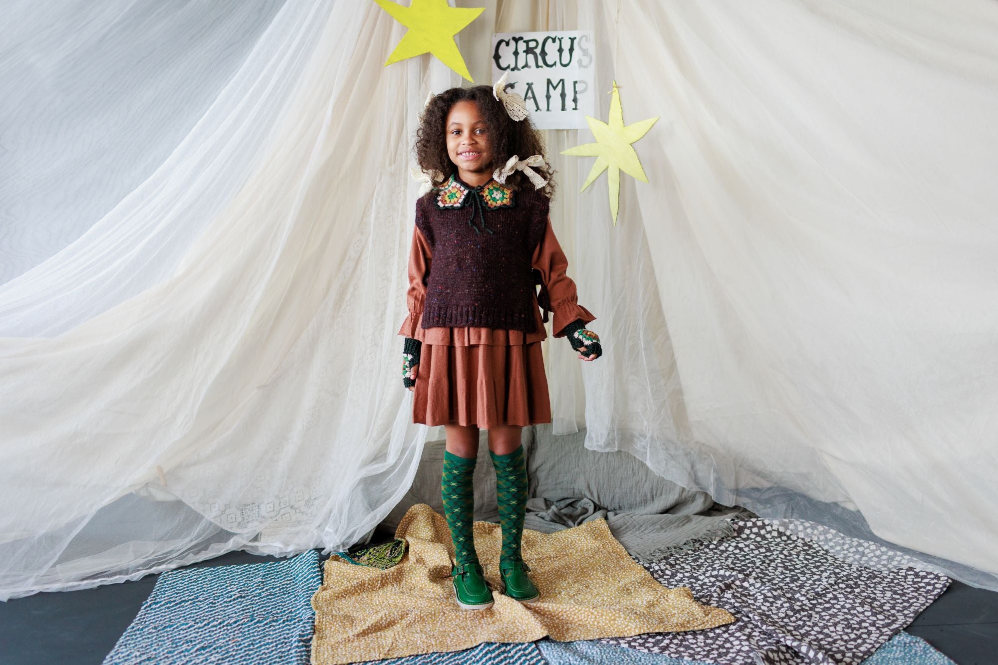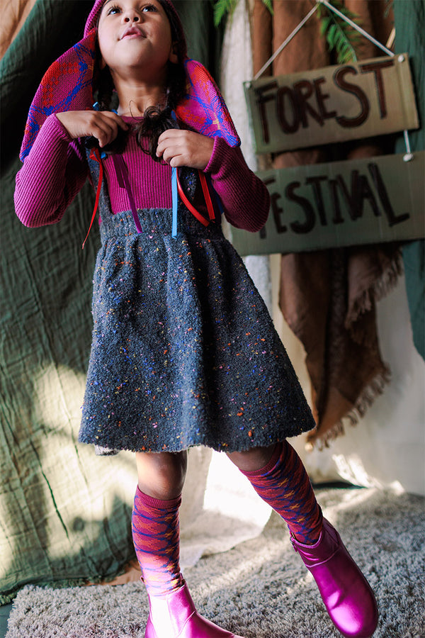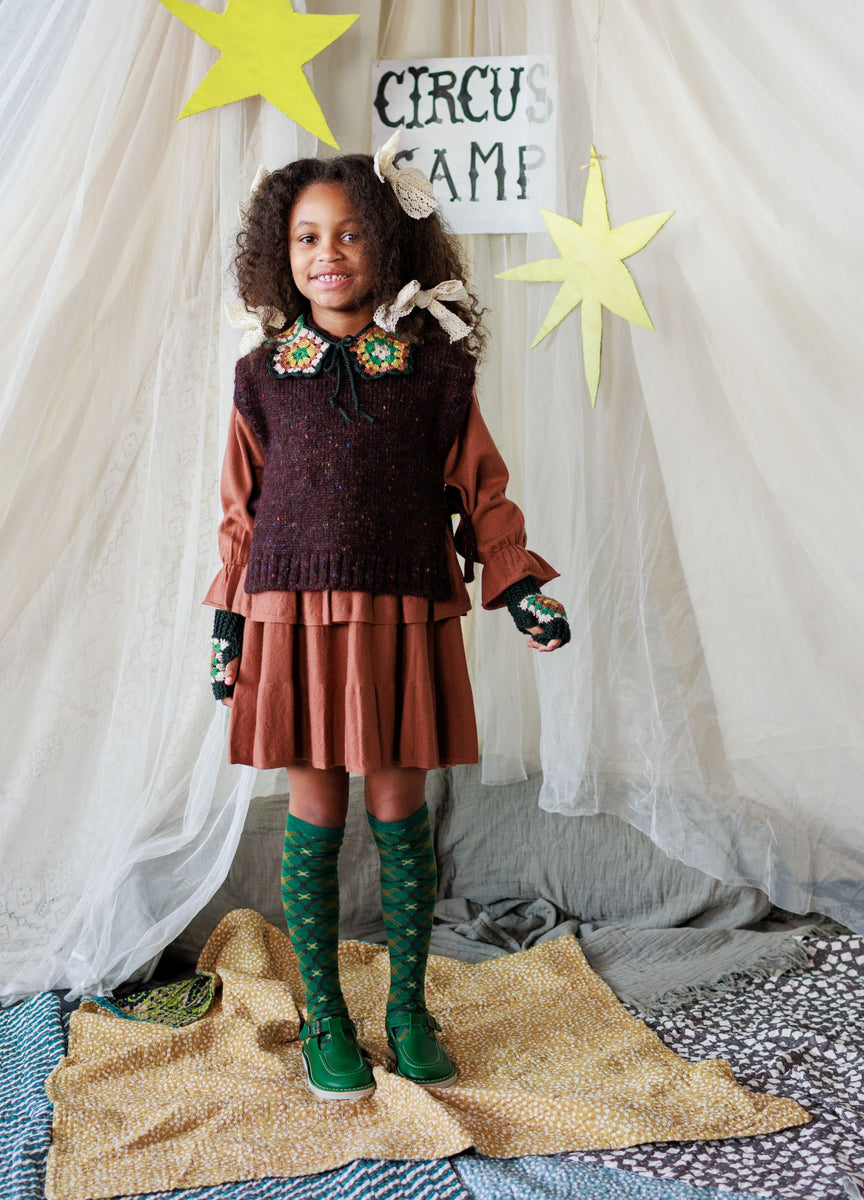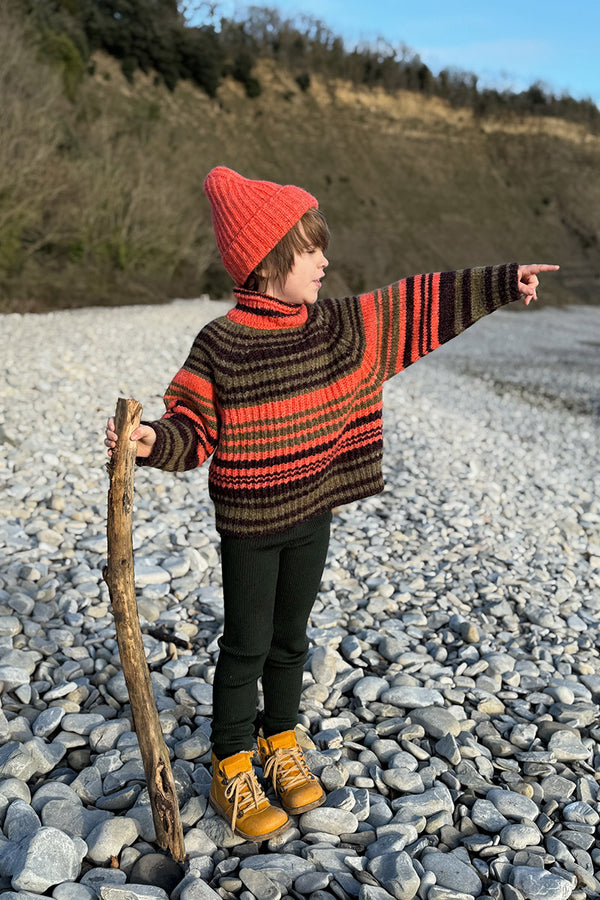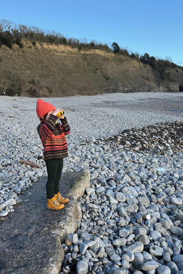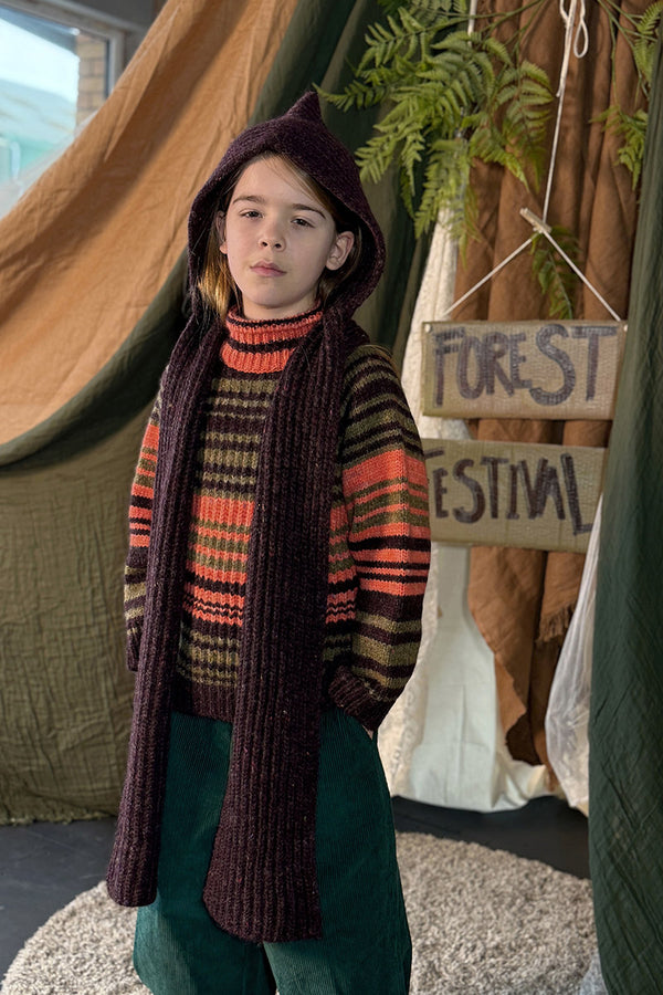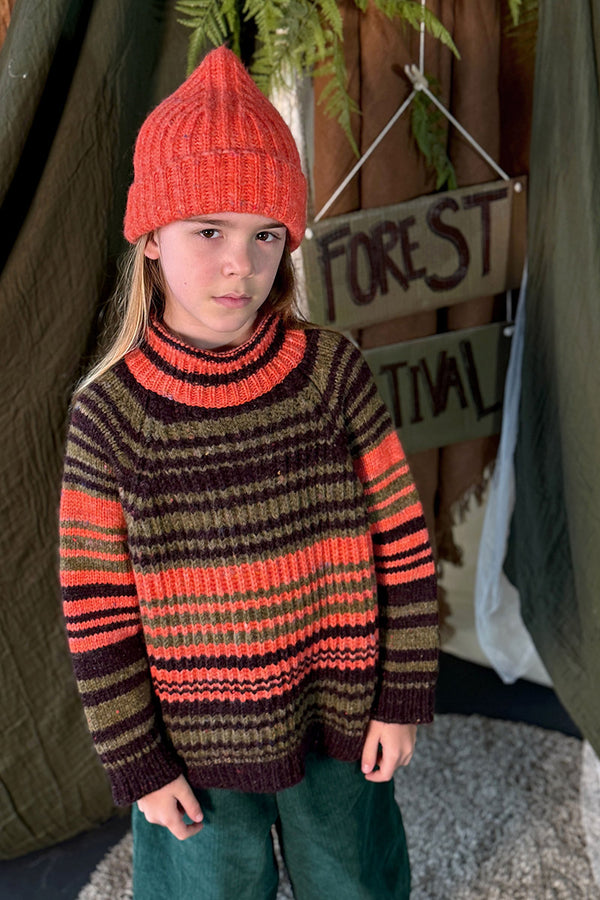 Come with us to the Circus Camp and the Forest Festival, where the vibrant energy of the 80s combines with outdoor adventures for Autumn days. A whimsical combination of nostalgia and nature, mixing retro jacquards and stripes, fun accessories, hand crochet, twirly dresses and more . All in our amazingly soft superfine Merino Wool!