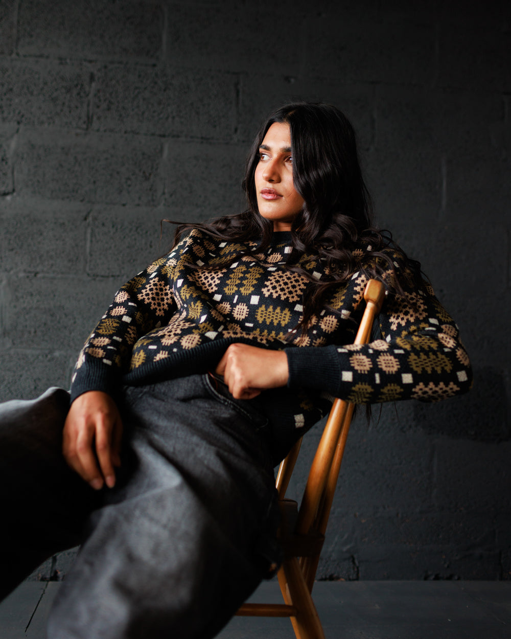 A relaxed-fit women's jumper with drop shoulders, knitted in a Welsh Tapestry-inspired jacquard in a compact medium weight. Finished with a round neck, ribbed cuffs and hem.