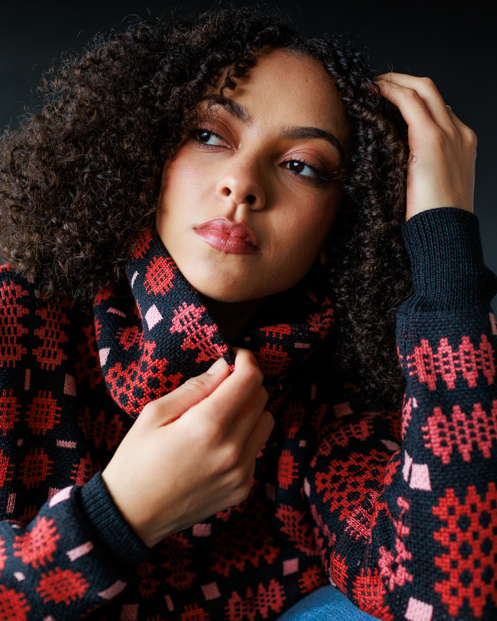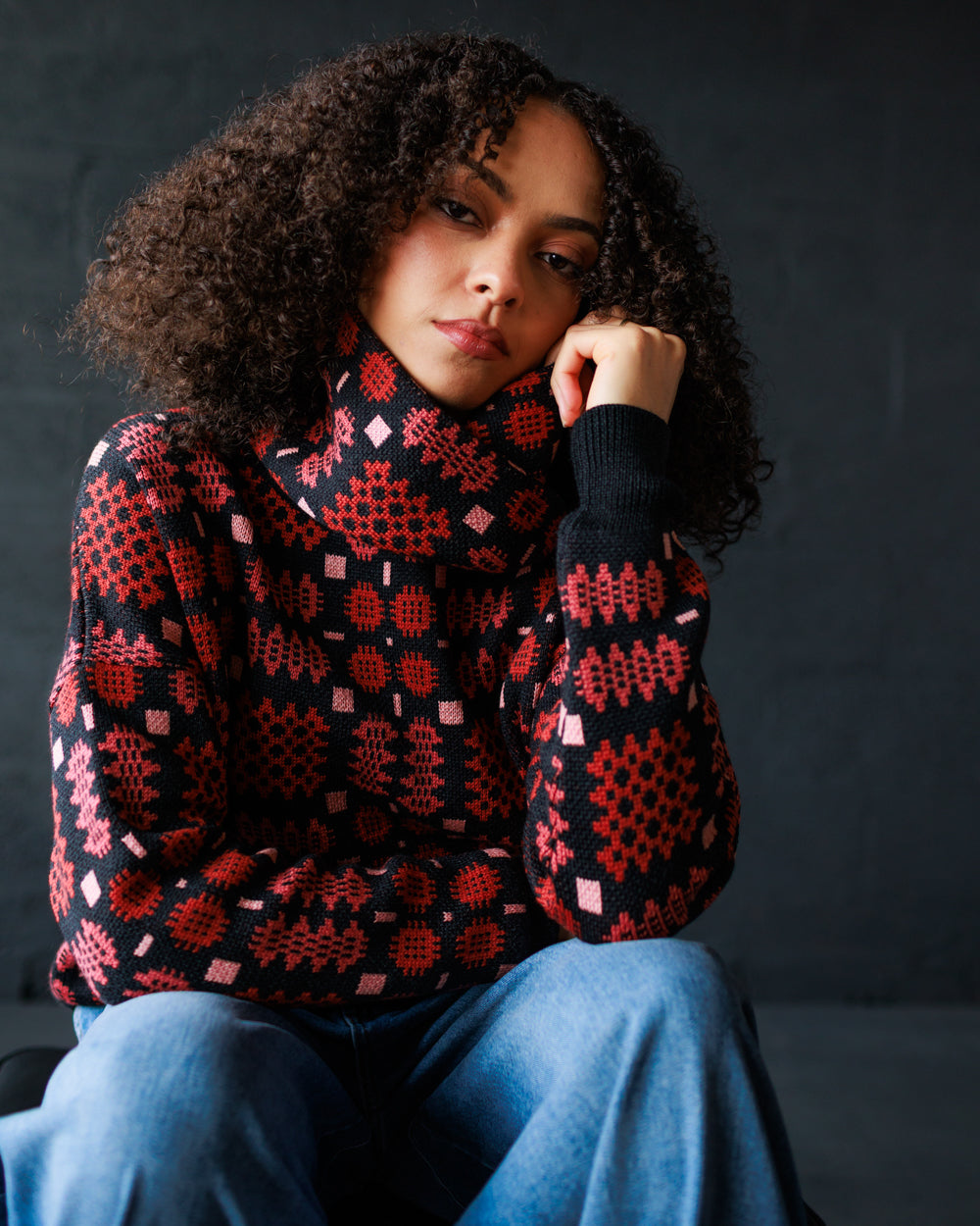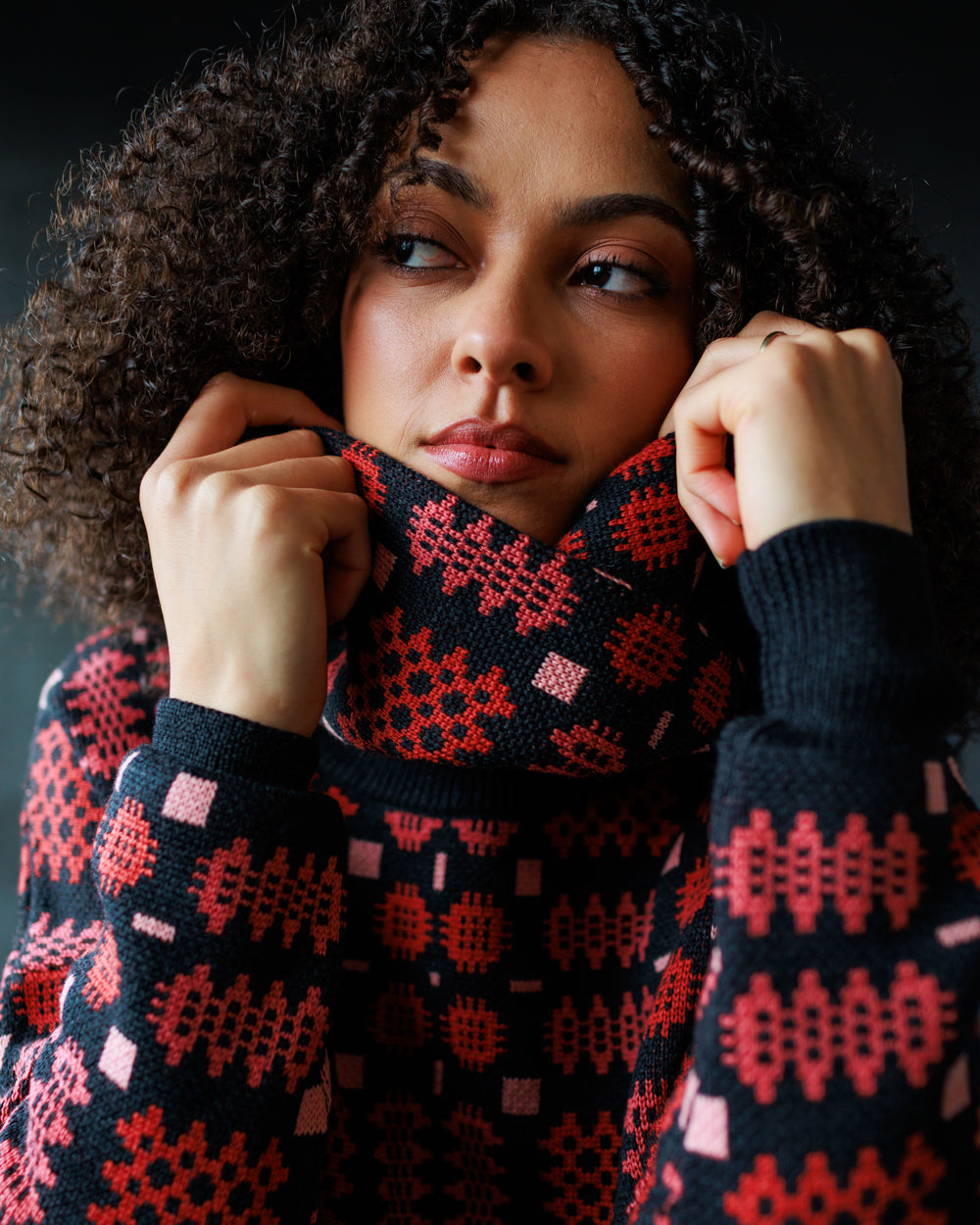 Our classic Carthen wrap features a bold, Welsh Tapestry-inspired jacquard. Wear it around the neck or head, with the twist at the front or back. Crafted from supersoft, mid-weight 100% extrafine Merino wool for extra coziness.