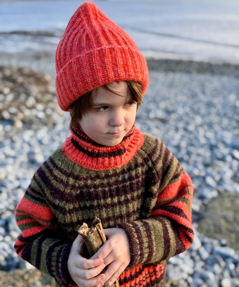 Knitted in a plain knit stitch, in a speckled cloud-like light yet chunky yarn.