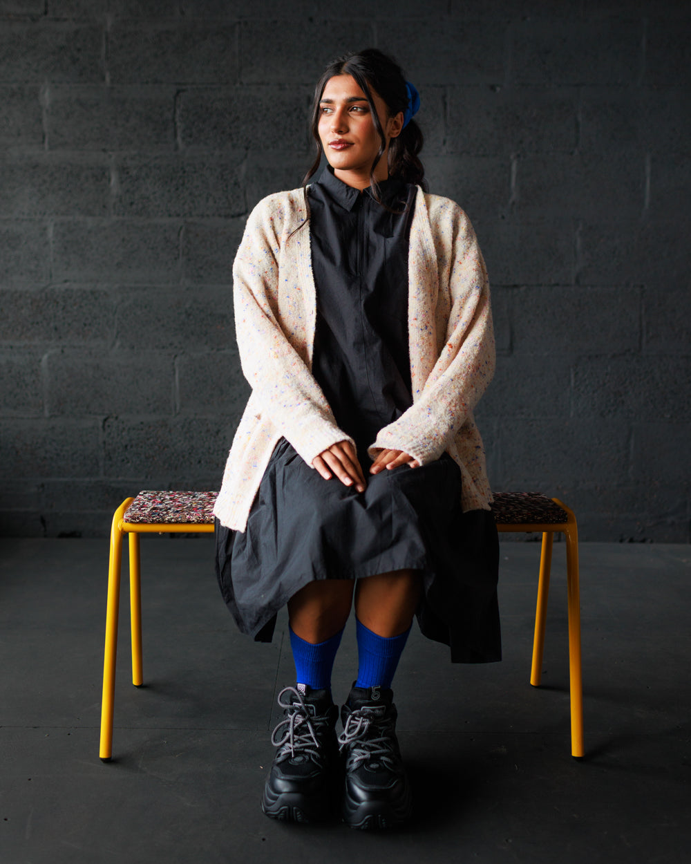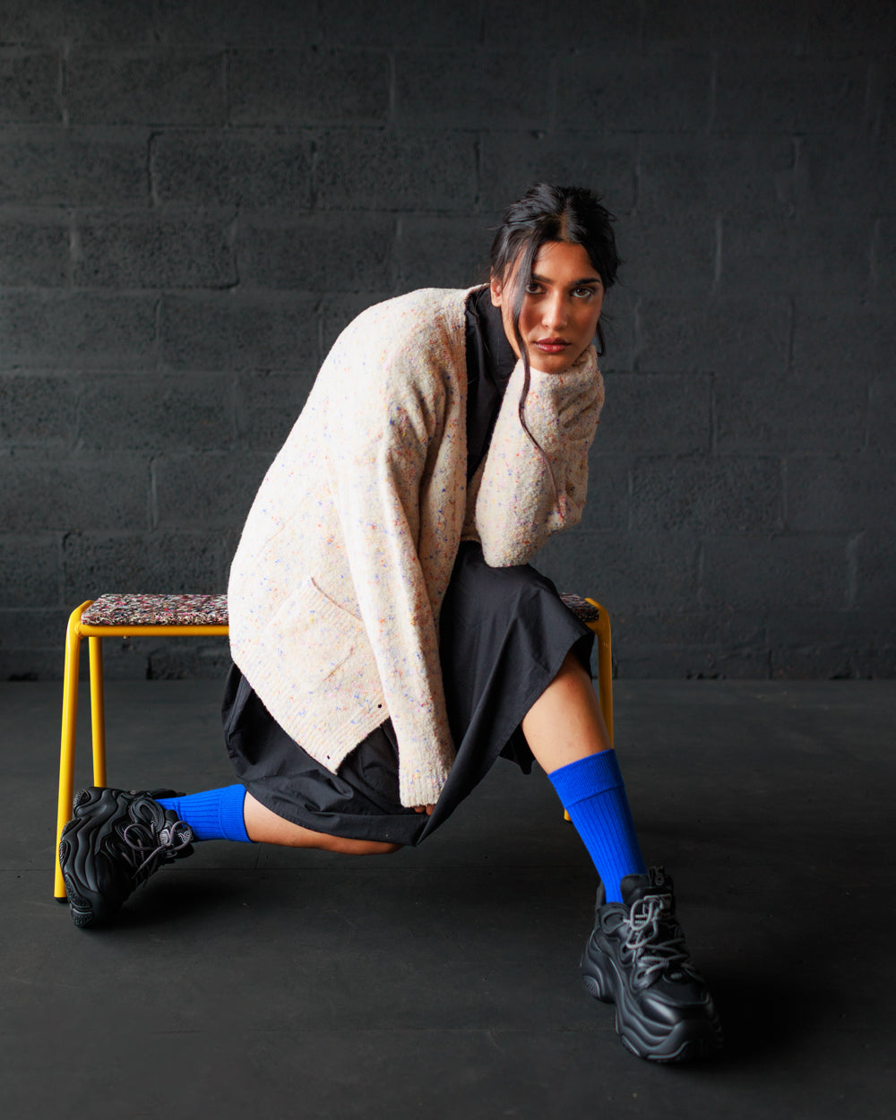 Knitted in reverse stitch to accentuate the rainbow sprinkles twisted through the yarn.