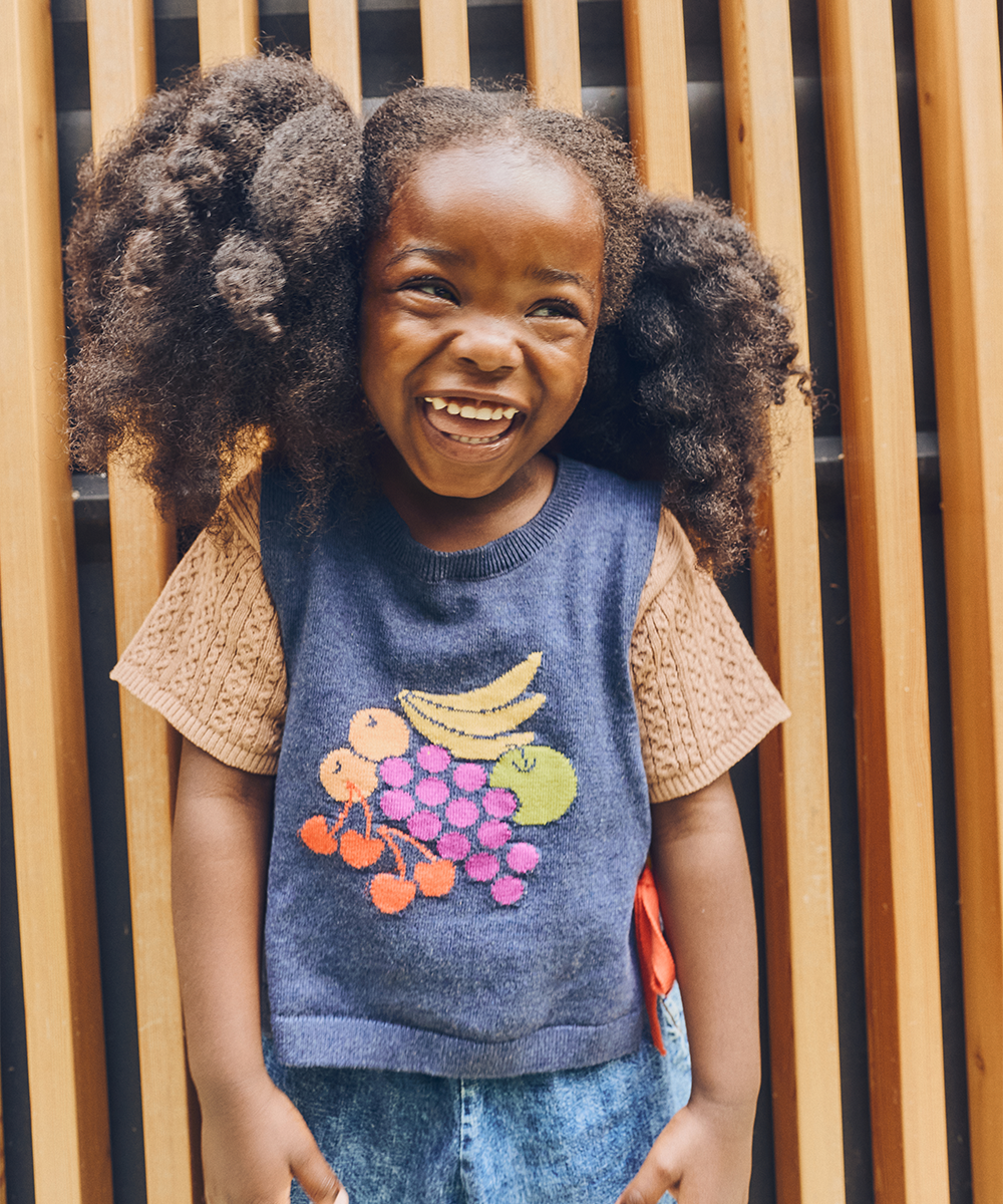 Knitted in a lightweight knit with a fun fruitbowl intarsia.