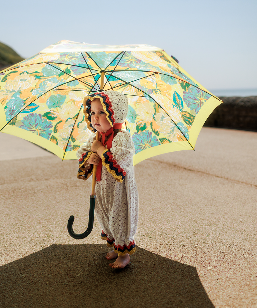 Knitted in a pretty lace stitch with striped frill edges.