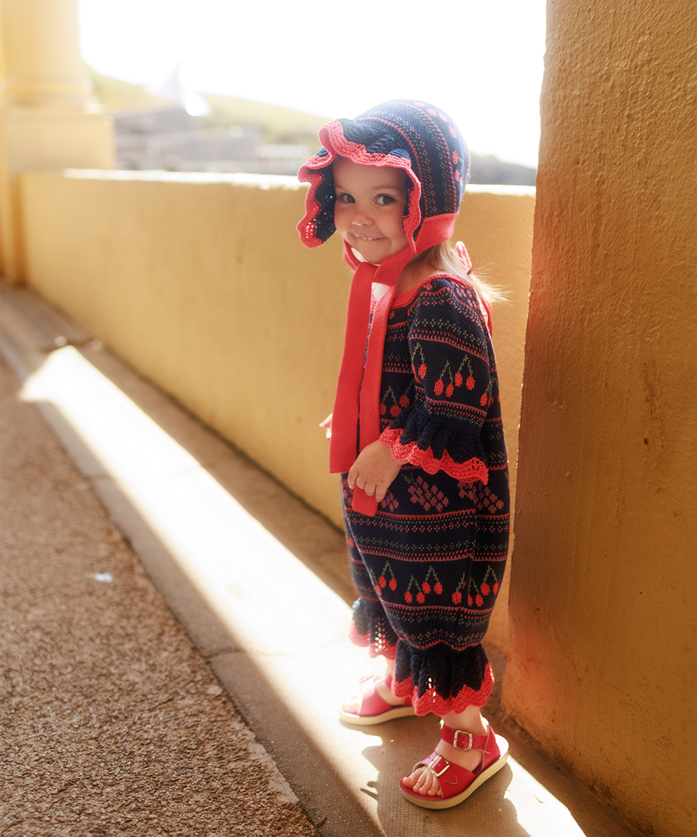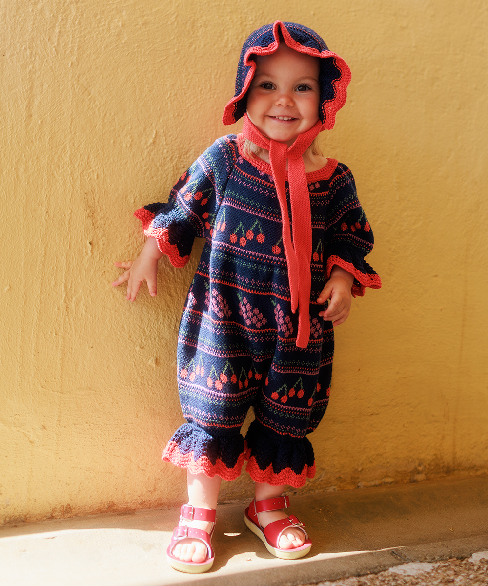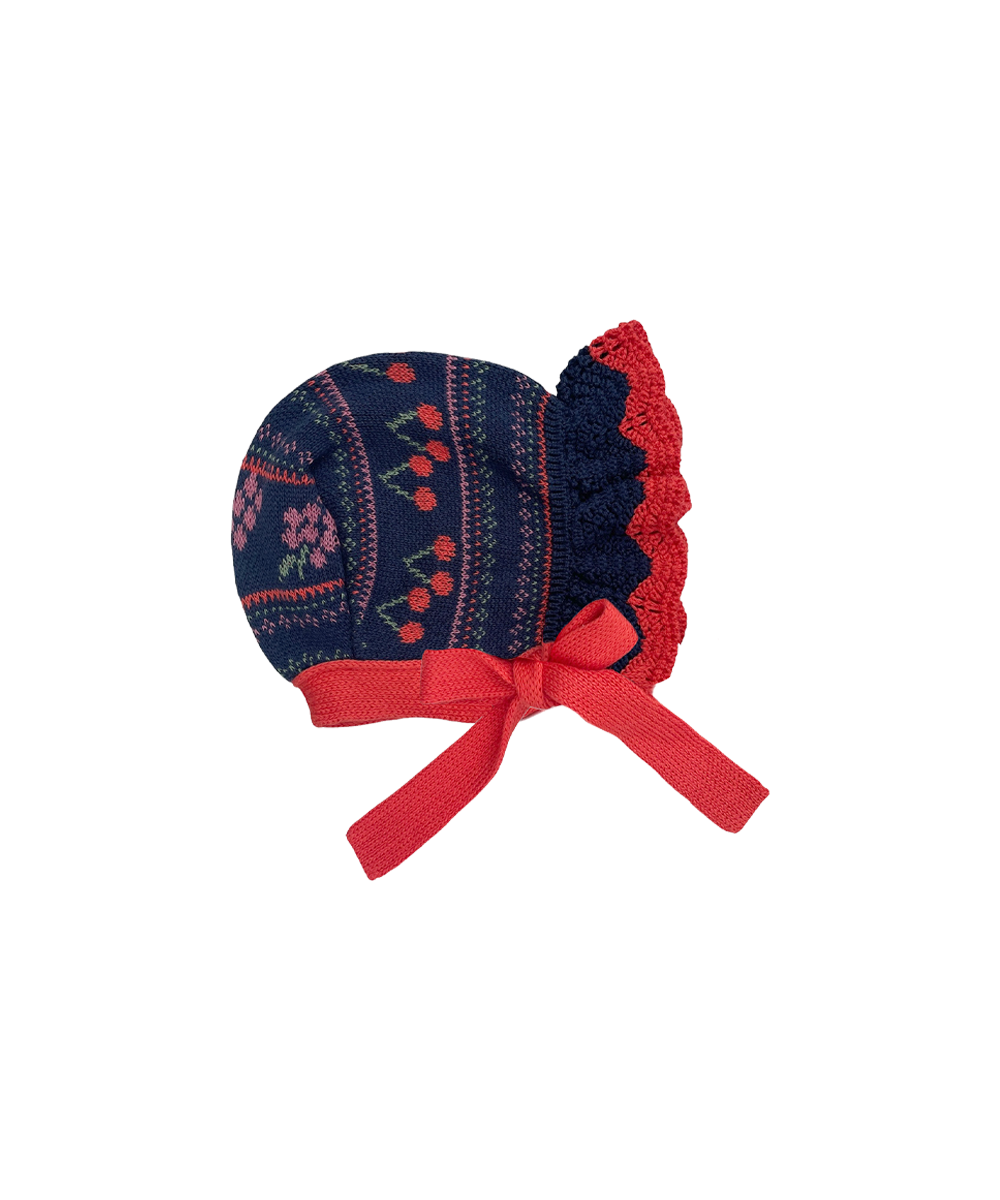 Knitted in a fruity jacqaurd of cherries and grapes.