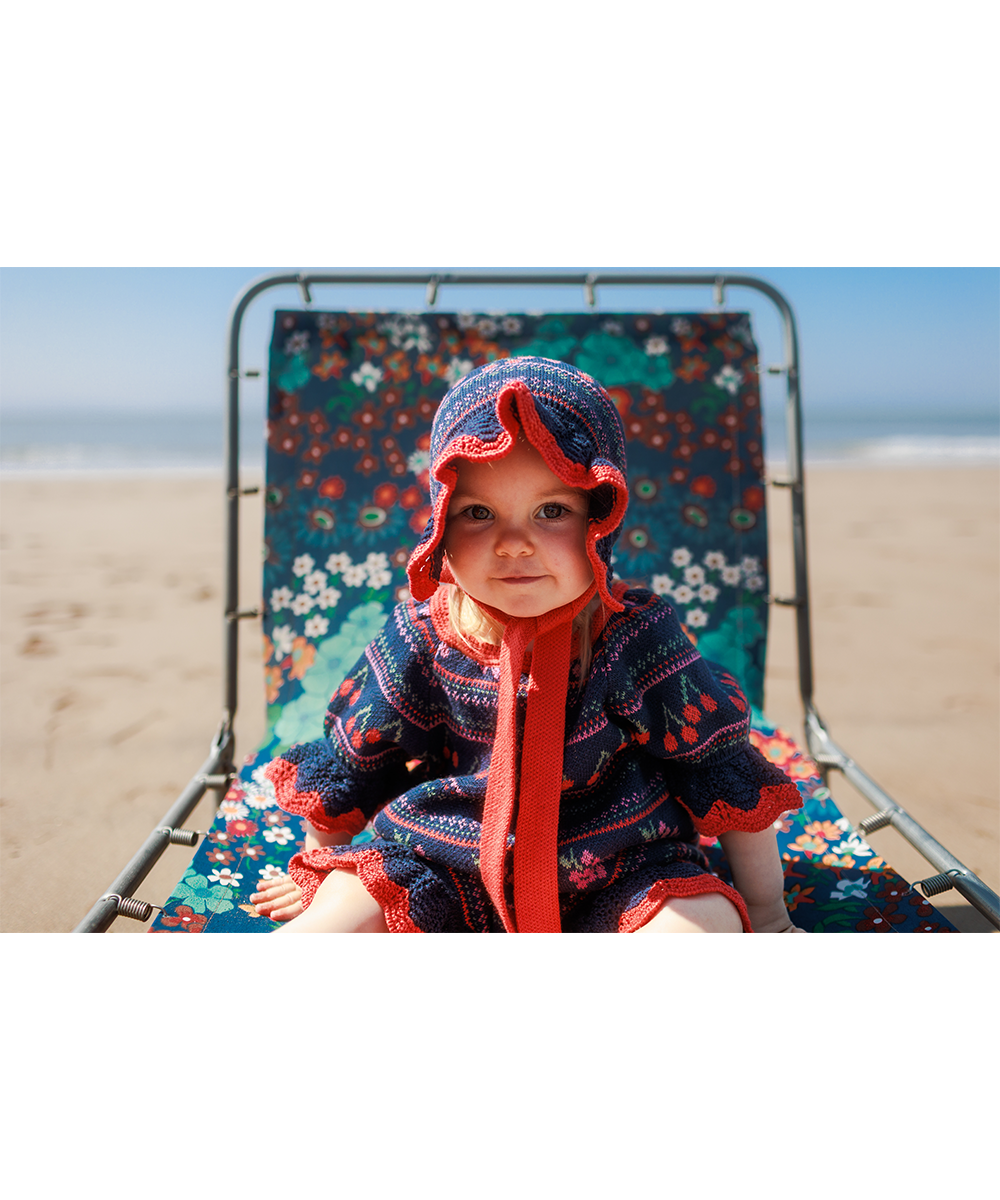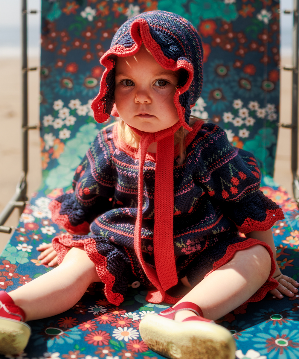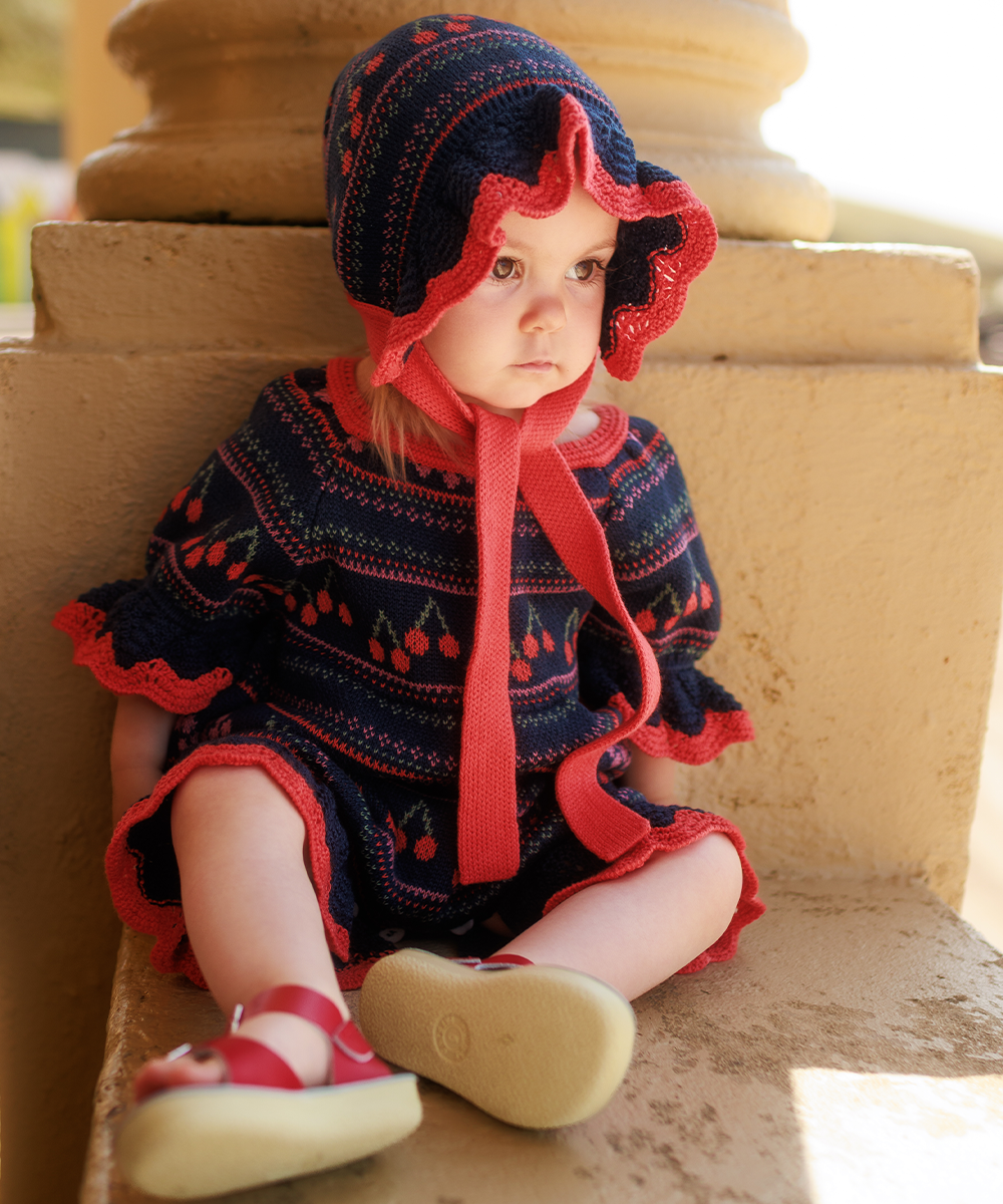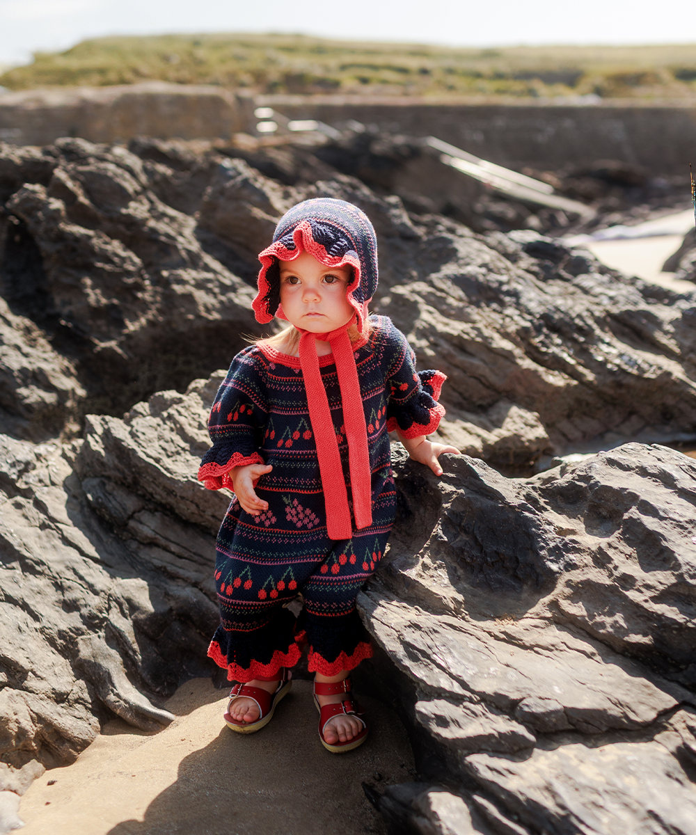 Knitted in a fruity jacqaurd of cherries and grapes.